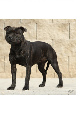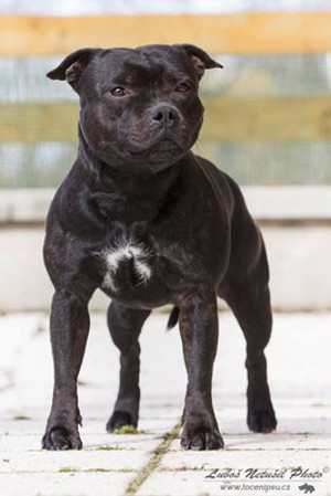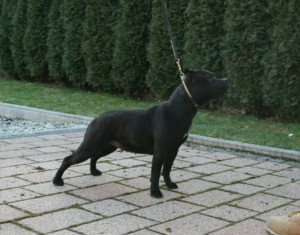 Tipična pripadnica pasmine stafordskih bulterijera, kompaktne građe, lijepe glave, odličnog kretanja, dobrih kuteva.